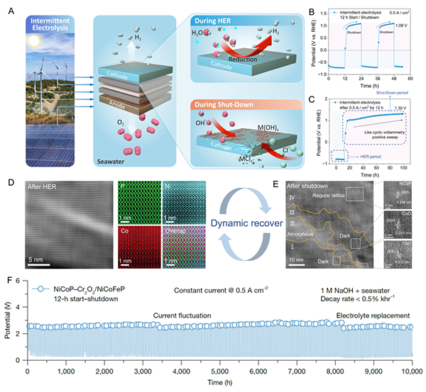 图 (A)海水电解在频繁启停循环工况下阴极的腐蚀示意图;(B,C)阴极在停车工况下氧化电位的定量分析;(D,E)阴极启停后微观结构及(F)在启停工况下海水电解制氢的稳定性能