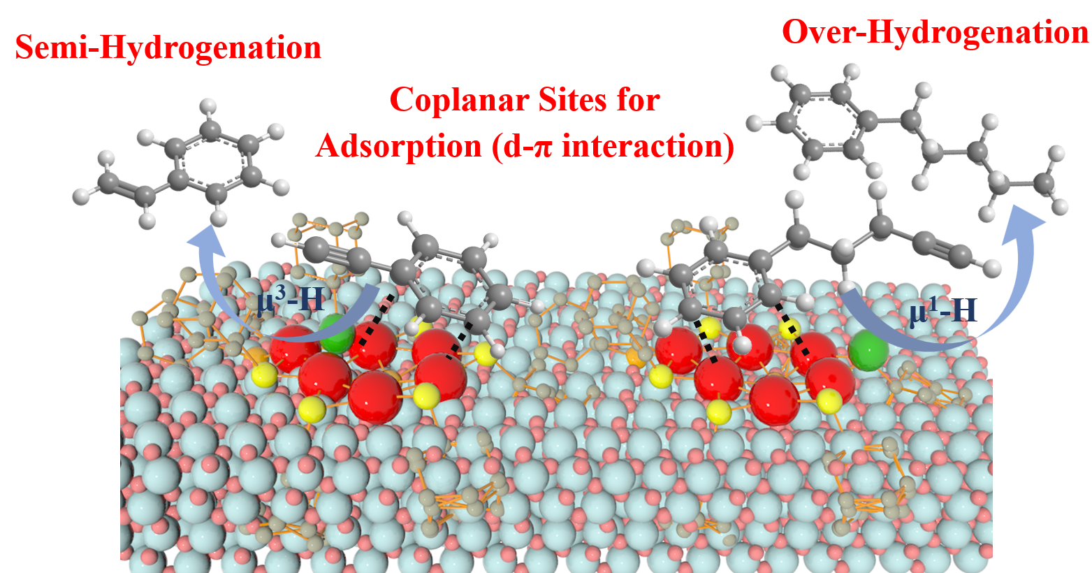 本工作中,研究人员提出硫醇与三苯基膦作为双配体的制备策略,高效合成具有精确空间结构的Pd6(S-Adm)6(PPh3)(PPh)纳米团簇(简称“Pd6”),其在芳香炔烃选择性加氢中展现出优异的催化活性(转化率>95%),苯乙烯的选择性为94%。单晶X射线衍射分析表明,Pd6纳米簇具有独特的“椅子”结构,其表面由6个共面Pd原子组成。实验表明,Pd6纳米簇的高选择性归因于硫醇和膦的协同作用,有利于产物适当的氢解离和脱附。由于Pd6的特殊结构,暴露的Pd原子可以为C≡C和苯环的吸附提供特定的活性位点。DFT计算表明,由于苯基的吸附限制,苯乙炔和苯乙烯只能在共面Pd6上加氢,结构上的限制使得苯乙炔比苯乙烯加氢更容易,进而显著提高了苯乙烯的选择性。该工作提出了模型分子Pd6纳米团簇,揭示了特定活性位点与炔烃加氢的作用机制,深入理解了Pd6催化剂结构与催化活性的构效关系。