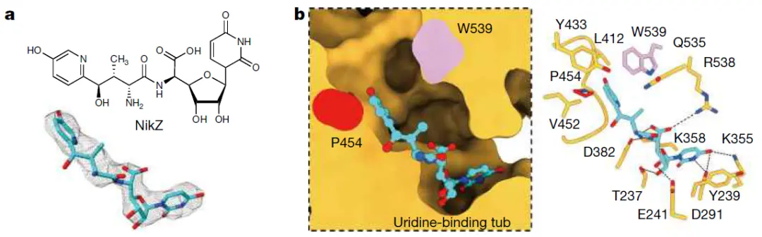 研究团队分别解析了PsChs1在5种不同状态下的三维结构,包括:自由状态、与底物(N-乙酰葡糖胺)结合、与几丁质低聚物结合、反应后与产物结合、与合成酶抑制剂(尼克霉素)结合这5种状态。根据这些不同状态下的结构,研究团队阐明了几丁质生物合成的完整过程,并且揭示了尼克霉素抑制几丁质生物合成的机制。