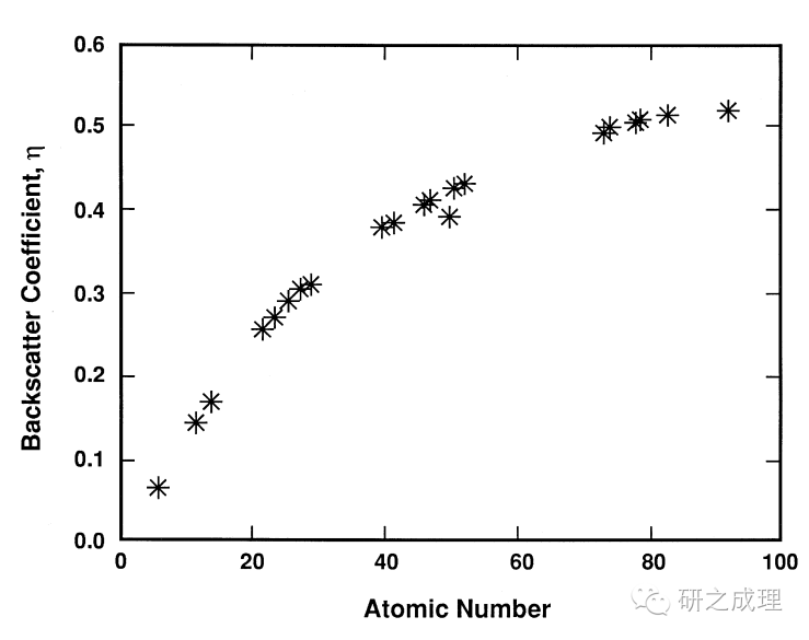 二次电子能量小,样品中绝大部分二次电子被再次吸收,从而很难从样品中逃逸出来,只有浅表层原子的二次电子才能逸出。所以二次电子能够很好的反映材料的形貌,受厚度干扰少。背散射电子同样可用于成像。因为背散射电子穿透能力强,深入样品内部,再被反射回来。所以其成像能力没有二次电子好。但是因为背散射电子的强度和原子质量直接相关(图7),所以背散射电子可用来区别不同元素。