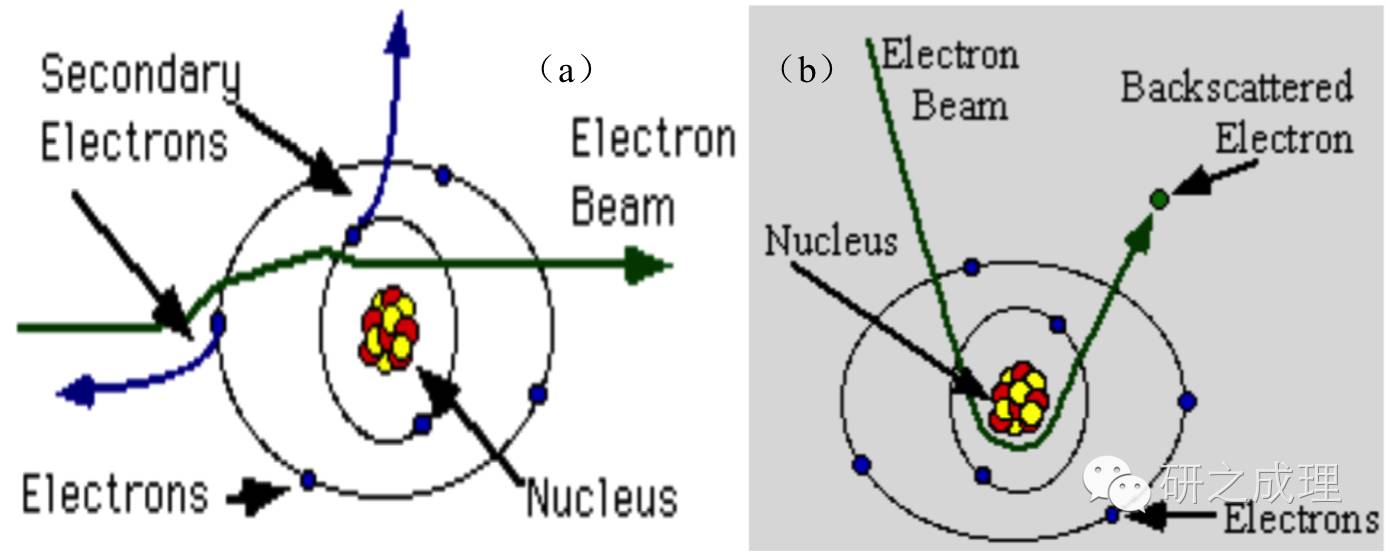 电子进入样品后,一部分散射、一部分被吸收、还有一部分透射。被散射电子中,角度大而被散射回去的部分称为背散射电子。这部分电子用于成像就叫背散射成像。背散射有分为两大类:弹性背散射和非弹性背散射。弹性散射不损失能量,只改变方向。非弹性散射不仅改变方向,还损失能量,如图5b所示。