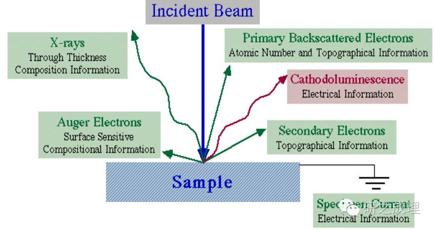 无论是SEM还是TEM,其主要目的都是成像。光与物体作用,使其呈现于人眼;在SEM/TEM中,电子取代光,与物体相互作用,使其呈现于屏幕。高速电子与样品相互作用后发射出一系列的“电磁波”(如图1)。