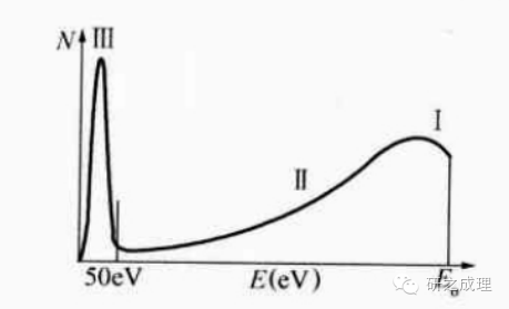 样品本身的电子吸收能量后,可能发生很多变化。其中原子外层的电子可能被电离,从而逃逸、形成二次电子,如图5a所示。如果从能量的角度考虑,弹性背散射电子能量最大(等于入射电子能量Eo),非弹性散射电子能量较小(分布范围宽),二次电子的能量最小(<50 ev),如图6所示。
