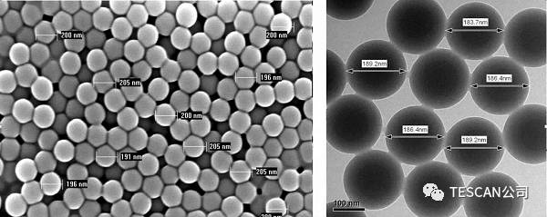 现在的镀膜设备一般都能精确控制膜厚,通常镀5nm的薄膜就足够改善导电性,对于有些特殊结构的试样,比如海绵或泡沫状,表面不致密,即使镀较厚的导电层,也难以形成通路。所以我们镀膜尽量控制在10nm以下,如果镀10nm的导电膜仍没有改善导电性,继续增加镀膜也没有意义。一般镀金的话在10万倍左右就能看见金颗粒,镀铂的话可能需要放大到20万倍才能看见铂颗粒,而镀铬或者铱则需要放大到接近30万倍。所以对于导电性不好的试样来说,可以根据需要选择不同的镀膜。镀膜之后,由金属膜代替试样来发射二次电子,而一般镀的金、铂都有较高的二次电子激发率,在镀膜之后还能增强信号强度和衬度,提升图片质量。只要镀膜不会掩盖试样的真实细节,完全可以进行镀膜处理,而不用纠结于一定要不镀膜进行观察,除非有特别不能镀膜的要求。当然,对于要求倍数特别高或者严格测量的一些观察要求,则要谨慎镀膜处理。毕竟在高倍数下,镀膜会掩盖一定的形貌,或者使测量产生偏差。如图4-7,左边是镀金处理的PS球在SEM下的测量结果,右边是TEM直接拍摄的结果,可以发现SEM的测量结果大约在195nm左右,而TEM的测量结果在185nm左右,这就是因为给PS球镀了5nm金而引起直径扩大了10nm左右。