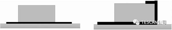 对于很多规则样品,比如块体或者薄片样品,也存在很多不合理的粘贴方式。很多人认为试样有一定的导电性,就将试样直接粘在导电胶带上,如图4-5左。样品表面和样品台之间依然会出现没有通路的情况,有时即使样品导电性好,可能也会因为有较大的接触电阻使得图像有微弱的荷电或者在大束流工作下有图像漂移。而图4-5右,则是开始将导电胶带故意留一段长度,将多余的长度反粘到试样表面去。这样使得不管样品体内导电性如何,表面都能通过导电胶带形成通路。而且即使样品整个体内都有较好的导电性,连接到表面的导电胶带相当于一个并联电路,并联电路的总电阻总是小于任何一个支路的电阻,所以无论试样的导电性任何,都应习惯性的将一段导电胶带连接到表面,以进一步减小接触电阻,增强导电性。