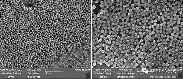 不过值得注意的是溶剂的选择,溶剂不能对要观察的试样有影响,否则会改变试样的初始形貌而使得图像失真。如图4-3,高分子球样品在用水稀释分散后仍为球形,而用无水乙醇分散后,形貌发生了变化。