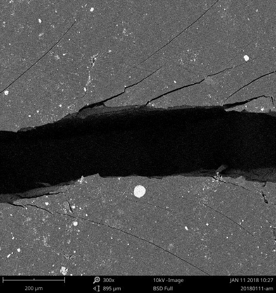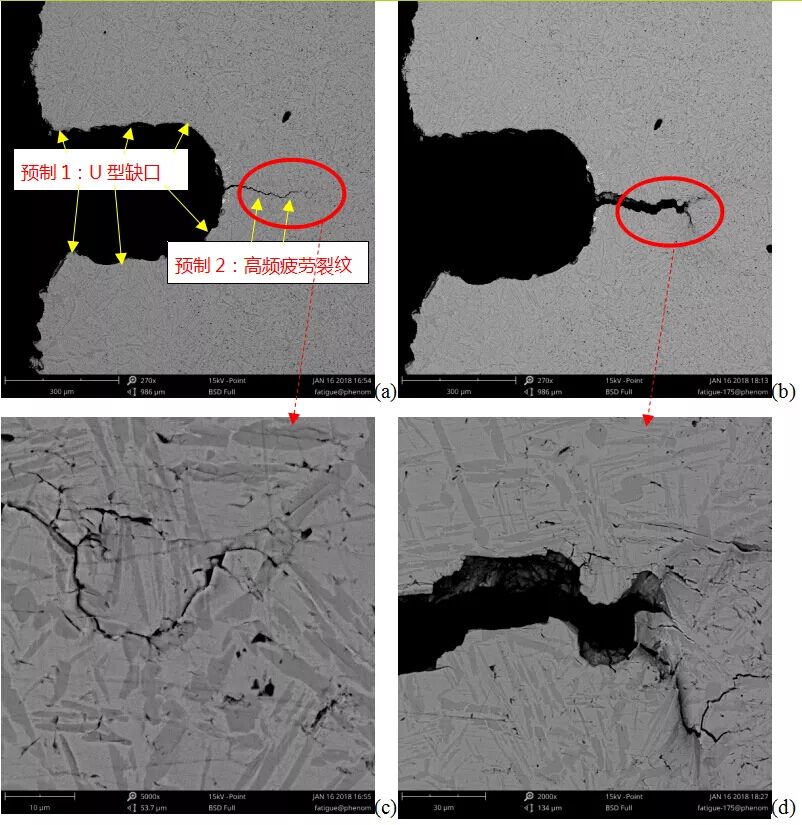 原位拉伸台用于橡胶弹性的研究 (a) (b) 图1 (a)飞纳电镜大仓版 (b)相匹配的拉伸样品杯选件 有的高聚物很脆,一敲就断,有的很坚韧,经过大量的变形依然不破裂,有的可以伸长自身的几倍,却能在外力去除之后恢复到原样,有的能够在变形之后保持新的形状不变。所谓橡胶是指施加外力时发生大的形变,外力去除后可以恢复的弹性材料。橡胶弹性在本质上是由熵变引起的,在外力作用下,橡胶分子链由卷曲状态变为伸展状态,熵减小,当外力移除后,由于热运动,分子链会自发地趋向熵增大的状态,分子链由伸展再恢复卷曲状态,因而形变可逆。 (a) (b) (c) (d) 图2 橡胶在拉伸过程中(ε=0%~200%)同一位置的变形特点 利用拉伸台在预先给予剪切裂口的橡胶条带上施加单向拉应力,观察裂口处裂纹的扩展情况,即可知晓该橡胶弹性体的弹性和变形特点。如图2所示,图(a)为初始状态,预制缺口的目的是为了方便定位,完整地观察到裂纹变化全过程,图(b)和(c)为中间状态,图(d)为形变量100%时的状态。该橡胶制品在经历2倍的拉伸变形时,依然可以保持裂口丝毫没有横向扩展,只在纵向发生伸长形变,据此可以推测,该材料具备较强的抗裂性。 原位拉伸台用于脆性材料的研究 (a) (b) (c) (d) 图3 PC塑料在拉伸过程中的形貌变化(a)初始状态(b)断裂缺口(c)断裂位置 2(d)断裂位置 3 图3显示了脆性材料某型号PC塑料在拉伸时的变形情况。虽然采用了最慢的拉伸速度0.02mm/min,但是在裂口位置依然只能观察到突然崩裂的裂口,以及扩展的方向和趋势。图(a)为初始状态,图(b)(c)(d)分别为断裂后不同位置的断裂形貌。可以看到裂纹位置光滑平整,几乎没有任何塑性变形的特征,属于比较纯粹的脆性断裂特征。 原位拉伸台用于疲劳研究 原位拉伸台可以在预设拉伸或压缩力范围做周期性拉-拉、拉-压疲劳测试。本文以275个循环周期的铝合金拉-拉疲劳研究为例,展示拉伸台用于疲劳研究的应用案例。图4(a)和(c)中显示了预制U型缺口1和预制高速疲劳试验机缺口2,在此基础上的原位拉伸台疲劳试验之后分别为图(b)和图(d)。可以看出,有明显的形貌变化,表面出现了褶皱,裂纹扩展也呈现出不同的趋势。 图4 原位拉伸台的疲劳试验(a)实验前270× (b)实验后270× (c)实验前5000× (d)实验后2000× 图5 原位拉伸台的疲劳试验结果分析 图5(a)是在高速疲劳试验机上预制的微裂纹,图5(b)是在飞纳扫描电镜原位拉伸台上275次低速疲劳后的裂纹。对图5的原位拉伸台疲劳试验之后的样品进行详细研究发现,在高速疲劳试验机上预制的裂纹较为平整,而且其断裂裂口处呈现出脆性的沿晶或穿晶断裂特征,而在图5下图中的一组新裂纹中则呈现出撕裂的韧性+疲劳断裂特征。这说明,应变速率对于样品的断裂机理有相当大的影响:高速疲劳试验(≥100Hz)会导致位错来不及扩展而呈现脆性断裂特征,低频疲劳试验(拉伸台,0.05Hz)则呈现出疲劳+韧性断裂特征。此拉伸实验中的原始Excel数据和275次疲劳循环、前20次疲劳循环截图见图6。通过实时动态监控,可以有效地帮助操作者确保实验按照预期加载曲线进行,而原始数据可以帮助分析实验结果,提取所需要的信息进行分析。 图6 拉伸试验原始数据以及前20次疲劳试验过程(T-t)截图 原位拉伸台用于堆垛结构的研究 图7中显示的是碳纤维条带中的纤维堆垛结构从初始状态到拉断状态的变化,放大倍数均为5000倍。按照图中显示t=0s时,并无明显断裂迹象,随着时间的延长,至t=1.6s时完全拉断,纤维之间完全脱离。提供此过程拉伸抗力的因素中可能包括:杂乱纤维之间的摩擦力 图7 碳纤维堆垛结构从初始状态到拉断状态的变化 其中,对此类纤维贡献最大的要归功于范德华力(van