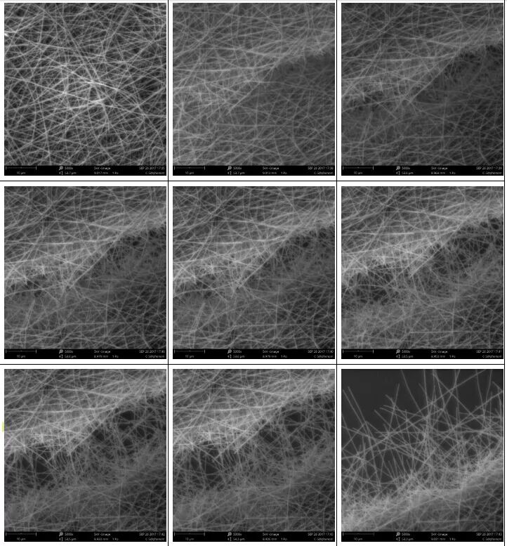 force)。图8的壁虎脚掌正是利用了范德华力才能够使自己的身体在陡峭的墙壁上随意游走而游刃有余。正如把两本书的纸张单页交替叠加之后,即使在纸张法线方向不施加任何压力,也难以徒手拉开一样,此类纤维也具有类似的特性。在拉伸过程中,动态的变化也较好地反映了拉伸力的来源,由于碳纤维本身是表面光滑的,而且并未受到除了重力以外的其他挤压力,因此摩擦力几乎可以忽略。加之已经观察到断裂纤维和杂质不多,据此便可以印证该纤维膜的主要强度是由范德华力提供。若采用传统的非原位方法来观察却要复杂得多。