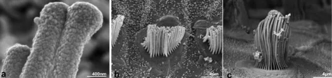 Rask-Andersen 等人 [1] 的图像证明,人类耳蜗似乎存在变化 。 这些扫描电镜图像揭示了耳蜗在解剖学上的变化,以提高他们的对人工耳蜗植入的认识。[1] 研究人员指出,关于人类耳蜗的精细结构的研究,可能会提供对插入和电刺激期间与电极相互作用的耳蜗内组织更好的理解。 为了能够使用扫描电镜观察耳蜗脱钙后的结构, 他们使用剃刀刀片将其分割 。 通过前期制样处理,可以清楚地观察到带有纤毛的耳蜗螺旋器,以及各种各样的毛细胞和其他结构。此外,还可详细分析人工耳蜗植入创伤部位。 图1:(a)人体内听毛细胞纤毛- 低频区。 (b)外部听毛细胞纤毛- 高频区。 (c)外部听毛细胞纤毛- 低频区。 图片来自Rask-Andersen等人。
