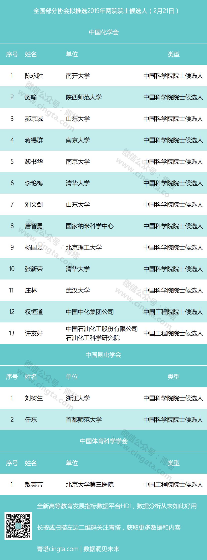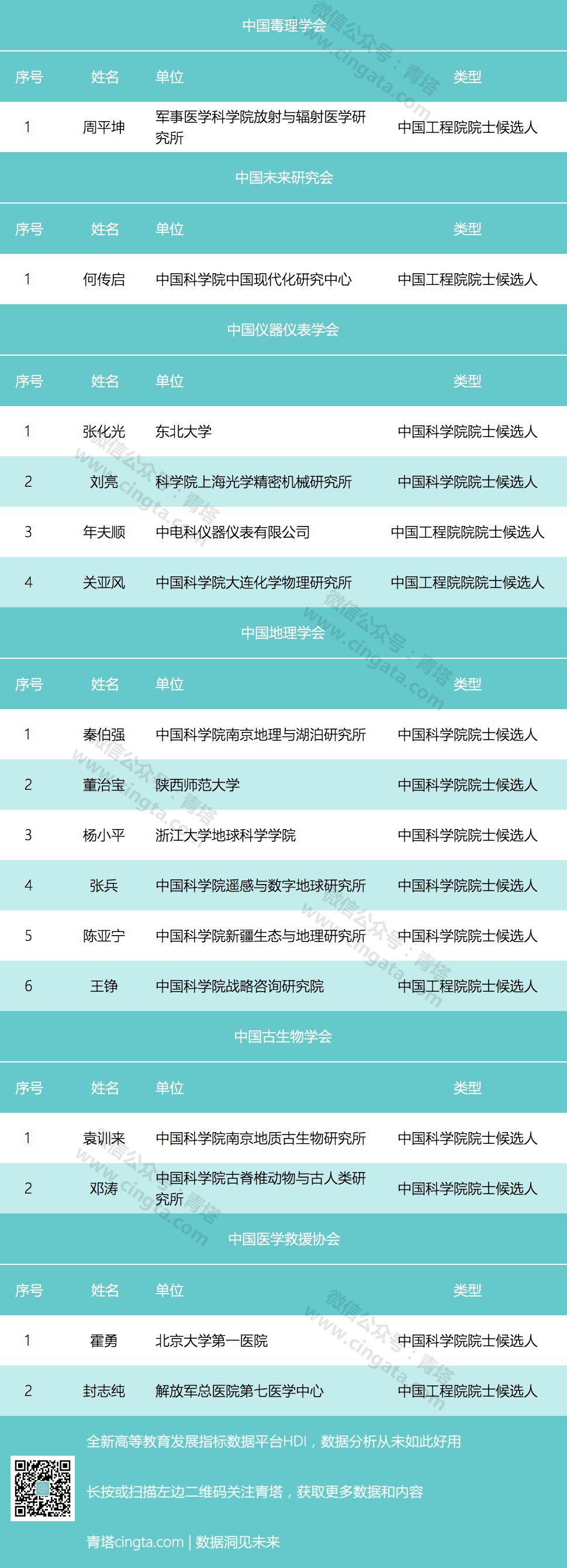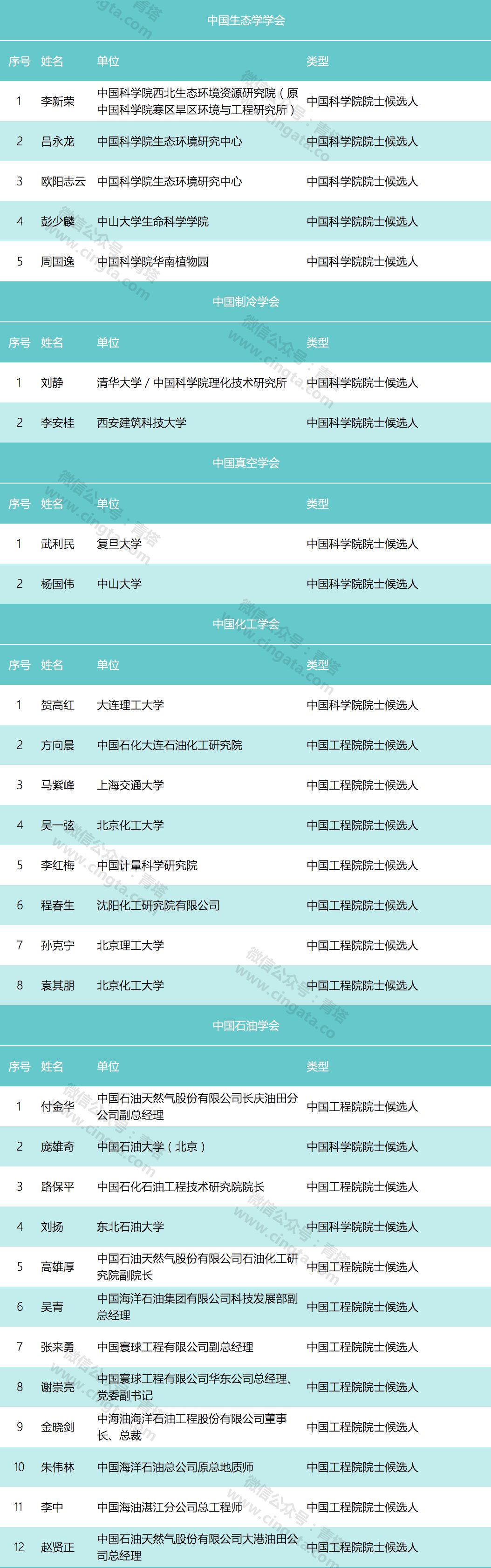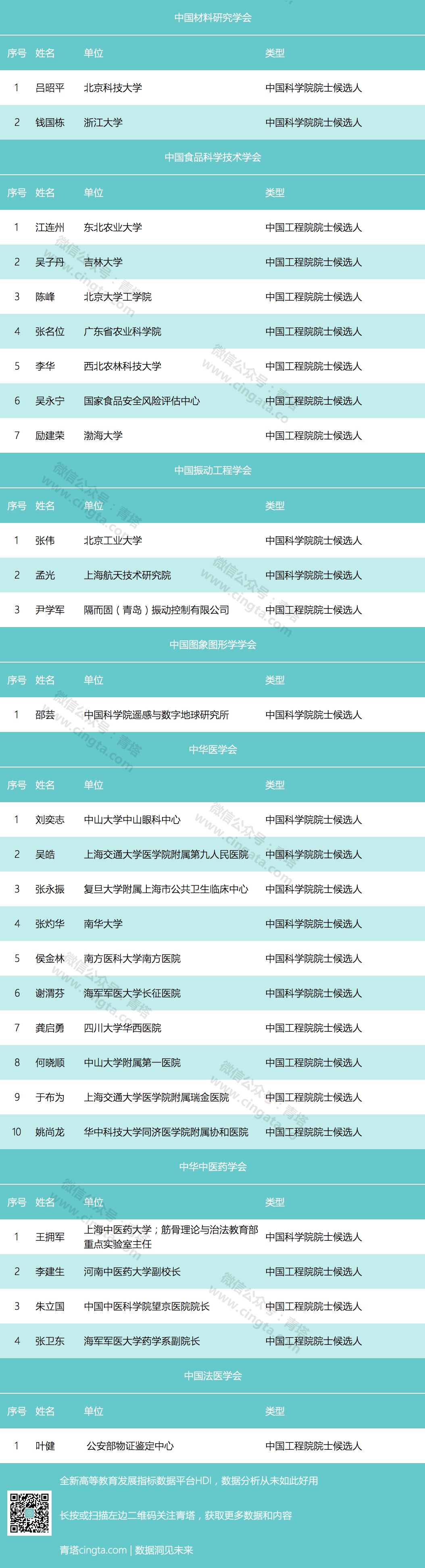 不过中国物理学会、中国计算机学会、中国环境科学学会、中国人工智能学会等学会尚未公示院士候选人,青塔也将持续关注。