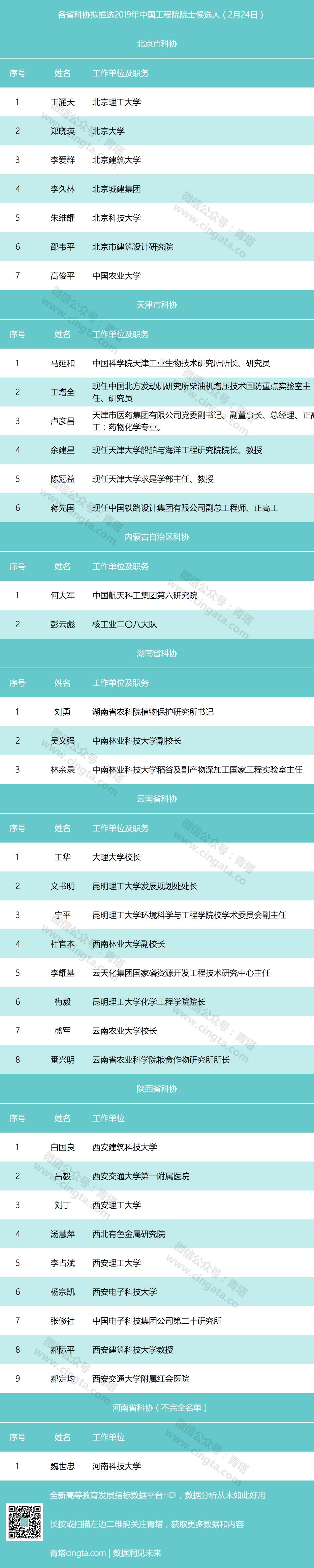 此外,继上海市科协之后,北京市科协、天津市科协、陕西省、云南省科协、湖南省科协、内蒙古科协等相继公示了拟推荐的中国工程院院士候选人名单,预计接下来各地的院士候选人将陆续出炉。