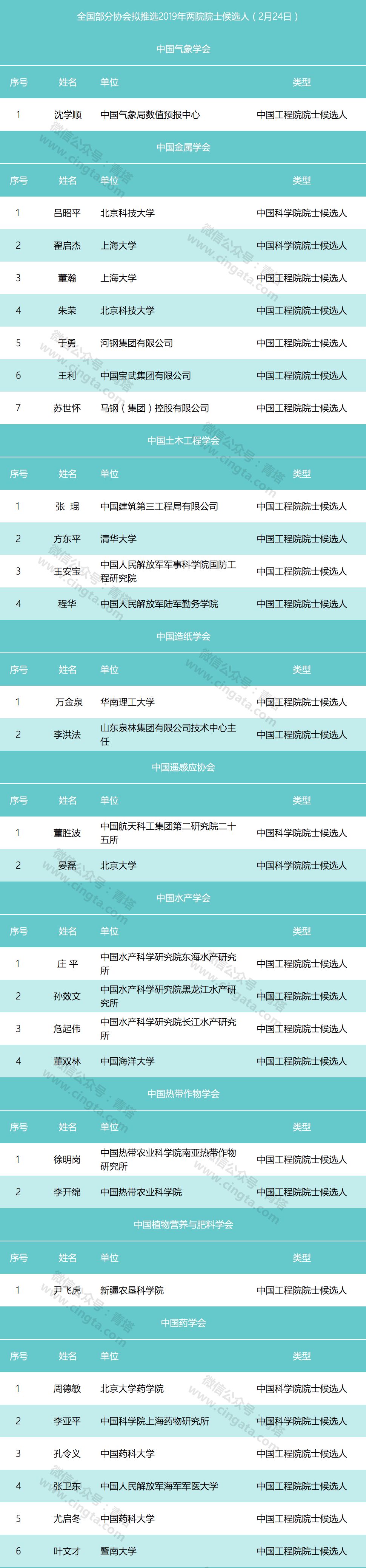 截至2月24日,全国全国各大学会和各省地方科协拟推荐院士候选人名单如下: