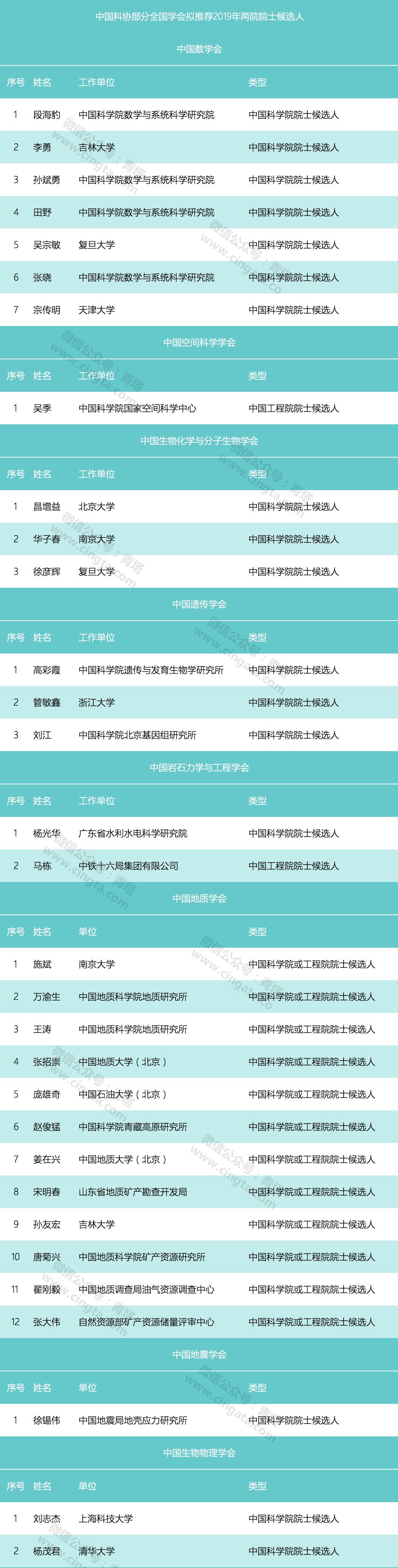 全国部分学会拟推荐2019年两院院士候选人(截至2月20日)