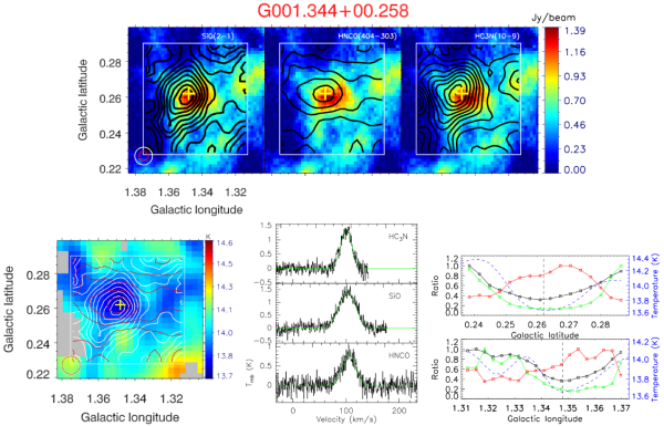 样本源G001.344+00.258中的HNCO(404-303)、SiO(2-1)、HC3N(10-9)谱线辐射强度等高线叠加于ATLASGAL尘埃连续谱图像上(上面三幅图),HNCO(404-303)、SiO(2-1)谱线辐射强度等高线叠加于尘埃温度图像上(左下图),从图像中黄色十字位置提取的三条分子谱线并进行拟合(下中图),三种分子的丰度比、尘埃温度穿过黄色十字位置沿银经、银纬方向的空间变化