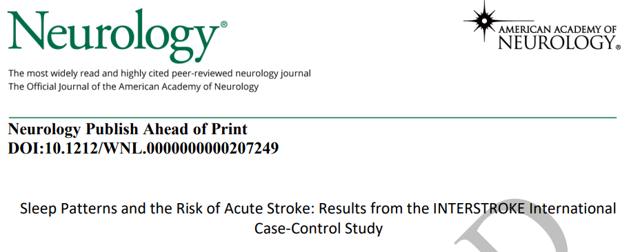 2023年4月5日,爱尔兰国立大学的研究人员在《神经病学》期刊上发表了一篇题为" Sleep Patterns and the Risk of Acute Stroke:Results from the INTERSTROKE International Case-Control Study "的研究论文。