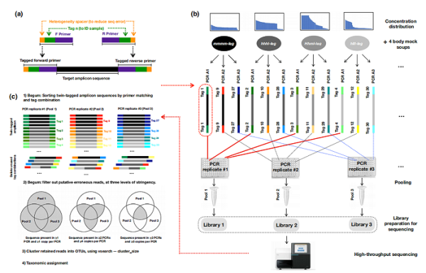近日,课题组在前期研究的基础上,进一步改进了高通量条形码技术流程,提高了运算速度,并能减少结果中的假阳性(如标签错配、嵌合体、错误序列)和假阴性。新流程改进了高通量条形码的实验设计和生物信息学分析,使用双胞胎标记法双向标记引物,将每个样本都进行多次独立的PCR扩增,且通过qPCR来优化最终使用的退火温度和循环数。在生物信息学分析部分,采用的是Begum,它在样本拆分时可以忽略为了测序中平衡碱基而添加在标签上的几个碱基,并允许引物序列的错配且提高了运算速率。Begum可去除由于标签跳动所产生的假阳性序列,以及通过设置多个PCR重复和某一序列的重复出现次数来过滤PCR和测序等产生的错误序列。