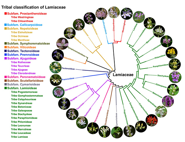 为了深入探讨唇形科的起源、性状演化、历史生物地理学及物种多样性的形成机制,亟需构建唇形科稳固的系统发育关系。在该问题的驱动下,昆明植物所、江西农业大学唇形科研究团队联合中国、伊朗、美国、澳大利亚、挪威、奥地利、土耳其等国的唇形科分类学者,对唇形科开展了全球范围的广泛取样,历经4年时间,获得了79属175个代表类群的叶绿体全基因组序列,取样覆盖了目前已界定的12个亚科。在此基础上,研究人员基于79个蛋白质编码基因,重建了唇形科系统发育框架,验证了12个亚科的单系性,明确了荆芥亚科、筋骨草亚科与其近缘类群的系统发育关系,提出了唇形科12个亚科22个族的新分类系统,其中,该研究建立了3个新族(图1)。此外,研究人员还阐述和总结了各亚科及各族的分类历史、地理分布、形态特征、属种多样性等内容。