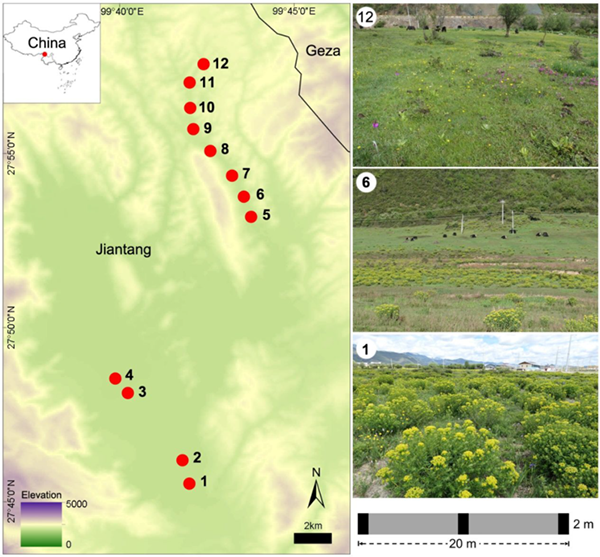 图1.滇西北大狼毒泛滥高山、亚高山草甸研究样地