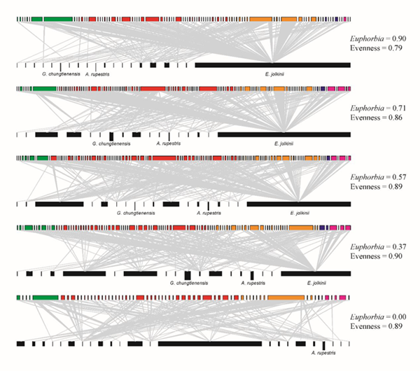 中国科学院昆明植物研究所研究员王红团队与英国布里斯托大学教授Jane Memmott团队合作,选择香格里拉12个大狼毒泛滥草甸样地,利用生态网络的理论和多学科交叉研究方法,在多个年季间开展了传粉网络研究及伴生植物繁殖适合度评估。研究发现,大狼毒对其伴生植物的开花多度、访花昆虫多样性和繁殖适合度均有负面影响;大狼毒多度的增加使传粉网络中物种互作的均匀度降低,这种物种互作强度的异质性打破了传粉网络原有的平衡,群落应对干扰的能力显著降低。该研究首次解析了该地区退化草甸生态系统中植物-传粉昆虫的互作关系和传粉功能;对帮助退化草甸生态系统加速复原的过程和维持物种多样性、群落结构和生态系统功能具有重要的理论意义和应用价值。