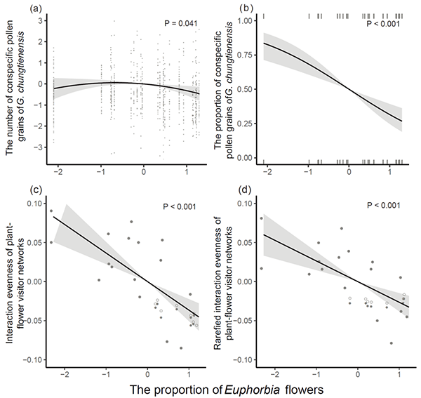 图3.大狼毒对代表性伴生物种繁殖成功和传粉网络物种互作均匀度的影响