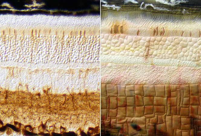 (左)Nomarski optics检测小鼠视网膜的截面,揭示了组织的结构。黑色为色素上皮细胞层,褐色为神经节细胞,锥光感受器和内丛状层。(右)艺术家使用染色,全片缝制,拼接后的产生的图案。