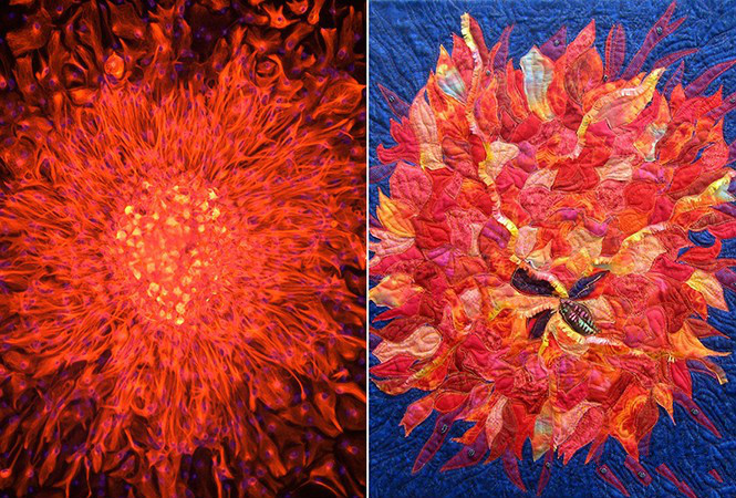 (左) 红色染料标记神经干细胞的球状簇,蓝色染料用于标记细胞核最常见蛋白。(右)艺术家使用机载贴花纱、欧根纱、网和珠子制作的织物图像。