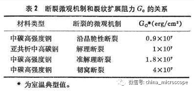 作为材料断裂韧性指标之一的裂纹扩展阻力,它不但是一个材料常数,而且也同断裂的微观机制有关。例如:当断裂机制是沿晶脆性断裂或解理断裂时,值较小;反之,当断裂机制是韧窝断裂时,则 值较大,如表2[断裂微观机制和裂纹扩展阻力的关系] 的关系" 所示。