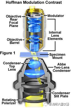 原理是利用斜射光照射,它将相位梯度转换为光强度变化,这样可以用来观察未经染色的样品和活细胞。这项技术可以视厚样品观察有立体感。罗伯特霍夫曼博士在1975年发明这项技术。