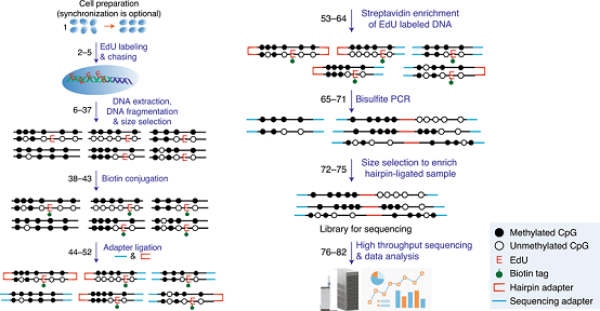 在以往工作中(Ming et al., Cell Research. 2020),朱冰课题组为研究复制叉过后DNA甲基化维持的动态过程以及调控机制,开发了Hammer-seq(Hairpin-assisted mapping of methylation of replicated DNA)。该方法结合了EdU(胸腺嘧啶类似物)标记新合成DNA链、点击化学反应在EdU位点添加biotin标签、Streptavidin亲和纯化和Hairpin全基因组DNA甲基化测序等技术,能够在DNA复制的不同时期,同时检测亲链和子链的DNA甲基化状态,进而可以研究DNA甲基化的维持动态及其调控机制。在Hammer-seq的开发过程中,该方法也在该课题组和清华大学教授颉伟课题组的一项合作工作中得到了应用(Wang et al., Nat Genet. 2020)。