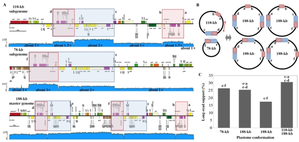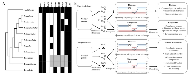 中国科学院植物研究所研究员张宪春研究组从事石松类和蕨类植物的分类和进化研究。近期,研究团队结合二代与三代DNA测序技术,揭示卷柏科植物存在结构变异复杂的质体与线粒体基因组。研究人员通过生物信息学分析发现,在伏地卷柏(Selaginella nipponica)188-kb的质体基因组的主构象中存在三个核糖体操纵子拷贝,可转换成包含两个近乎等比例存在的110-kb和78-kb的亚基因组构象;伏地卷柏的线粒体基因组包括总长为110-kb的27条contigs,所有contigs的两端均含有同向重复序列,可介导多种构象的相互转换。两种细胞器基因组共享较多的tRNA缺失、高GC含量和高碱基替换速率以及复杂的结构变异等特征。该研究对苔藓、石松、蕨类和种子植物中控制细胞器DNA复制、重组和修复系统的核基因进行比较分析,发现质体靶向的基因有不同程度的减少甚至丢失;而作用于质体和线粒体的双靶向基因数目与序列均保守并正常转录。基于此,该研究提出如下假说:由于质体靶向修复系统的弱化和缺失,双靶向的核基因在卷柏质体基因组中复制、重组和修复中发挥重要作用,是质体与线粒体基因组趋同演化的重要因素。该研究揭示早期陆地植物卷柏中独特的细胞器基因组演化模式及机制,拓展对植物界细胞器基因组演化的认识。