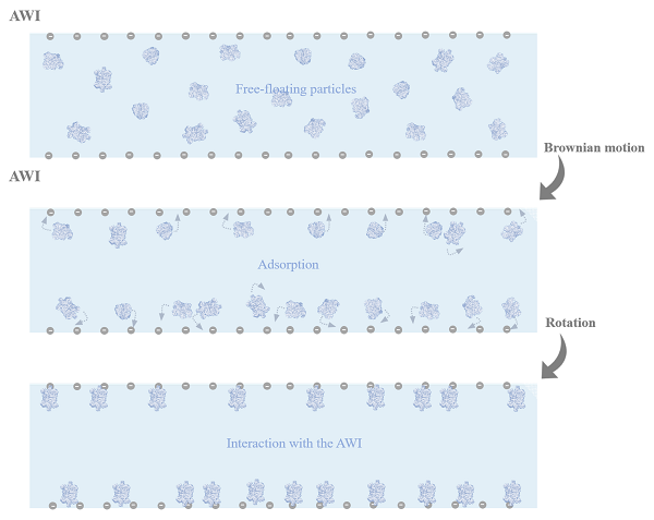 蛋白质通过布朗运动至气液界面附近,被由带负电的气液界面形成的势阱捕获的示意图。捕获的过程为蛋白质的旋转使其在势阱中的能量最低。最低能量状态决定优势取向分布。