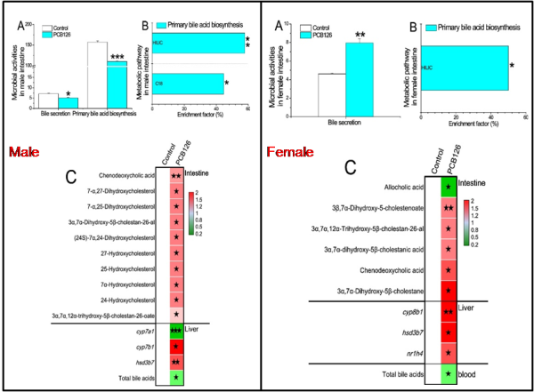 粪便宏基因组分析表明,PCB126抑制了雄鱼肠道中与初级胆汁酸代谢相关的微生物活动,从而阻碍了初级胆汁酸向次级胆汁酸的转化,导致雄鱼肠道中初级胆汁酸浓度升高,肝脏内胆汁酸主要合成途径被抑制(cyp7a1)。在雌鱼中,PCB126暴露同样干扰肠道微生物的胆汁酸代谢功能,导致肠道内初级胆汁酸浓度升高,法尼酯X受体(FXR)通路激活。