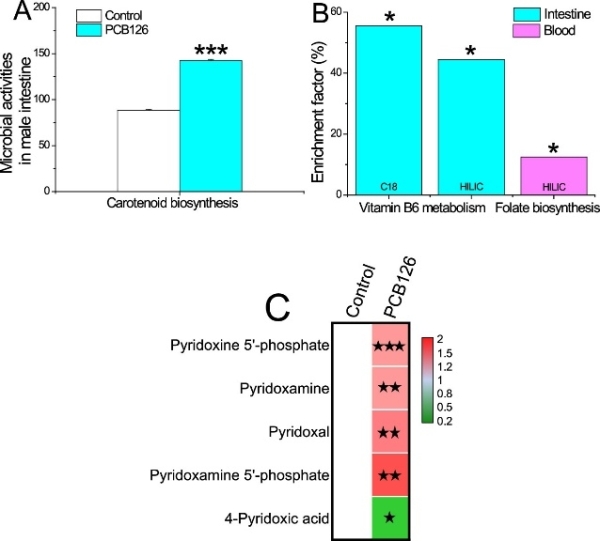 科研人员主要采用宏基因组和代谢组学分析方法,针对AhR信号通路介导污染物对肠道微生物和宿主健康开展进一步研究。主要结论如下:(1)PCB126激活AhR通路,干扰肠道菌群的组成、丰度、多样性和代谢功能;(2)PCB126压力下,微生物调节的胆汁酸代谢转化功能被抑制,肠道内初级胆汁酸蓄积;(3)多种必需维生素的微生物合成和降解活动被抑制,雄性斑马鱼维生素B6累积,而雌性斑马鱼多种必需维生素缺乏;(4)PCB126通过AhR通路干扰微生物-肠道-血液-肝脏组织系统的代谢信号交流。