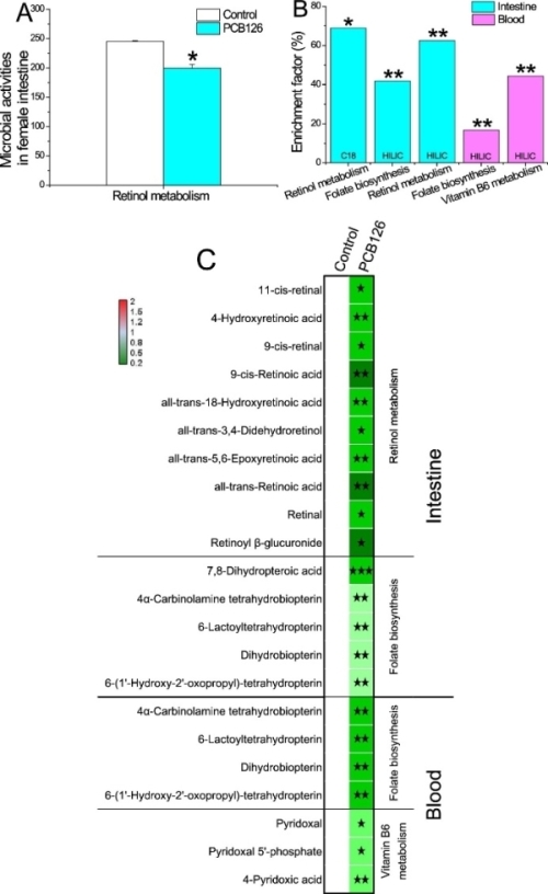 宏基因组和代谢组分析均表明,PCB126暴露显著影响微生物-肠道-血液-肝脏系统内多种必需维生素的合成与代谢(如视黄醇、维生素B6和叶酸等)。在雄鱼肠道内,PCB126抑制维生素B6的细菌降解,导致维生素B6活性代谢产物浓度升高,其降解产物浓度下降(4-pyridoxic acid)。异常高浓度的维生素可能引起细胞毒性,损害鱼体健康(图2)。在雌性肠道内,PCB126抑制了多种必需维生素的微生物代谢活动,包括视黄醇、维生素B6和叶酸等(图3),导致其活性代谢产物在斑马鱼肠道和血液中的浓度显著下降,形成系统性缺乏。