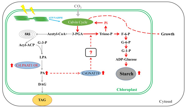 图2.莱茵衣藻LPAAT1介导的碳流调控模式图