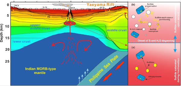 该研究在西太平洋弧后盆地热液区玄武安山岩中发现了岩浆硫化物饱和及溶解现象,通过全岩地球化学和矿物化学的研究,明晰了硫化物饱和时岩浆房深度以及寄主岩浆的温度、氧逸度、含水量和硫含量等特征,揭示了岩浆分异过程中熔体的硫含量增加以及温度降低、熔体成分变化可导致硫化物饱和时所需硫含量的降低,并共同驱使玄武安山质岩浆的硫化物饱和。岩浆上升喷发过程中挥发份(H2O、S等)的去气/出溶作用将导致其携带的硫化物发生溶解。由于岩浆中硫化物作为亲铜元素最主要的寄主矿物,该溶解过程将使Cu重新进入熔体中,并再分配进入出溶的岩浆流体,从而形成富金属元素的岩浆流体,其在同喷发去气过程中可直接释放进入海底热液系统的流体和/或海水中。