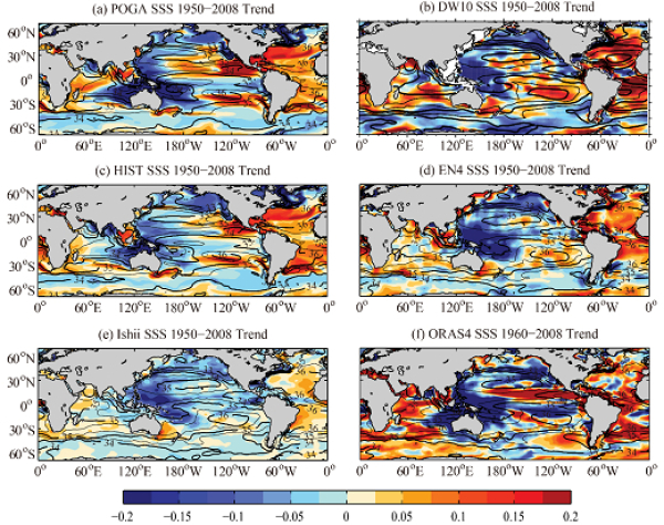 图1.6组不同数据集海表盐度长期变化趋势空间分布图。(a)POGA(1950-2008),(b)Durack and Wijffels(2010; 1950-2008),(c)HIST(1950-2008),(d)EN4(1950-2008),(e)Ishii(1950-2008),(e)ORAS4 (1960-2008),单位:PSU/10年
