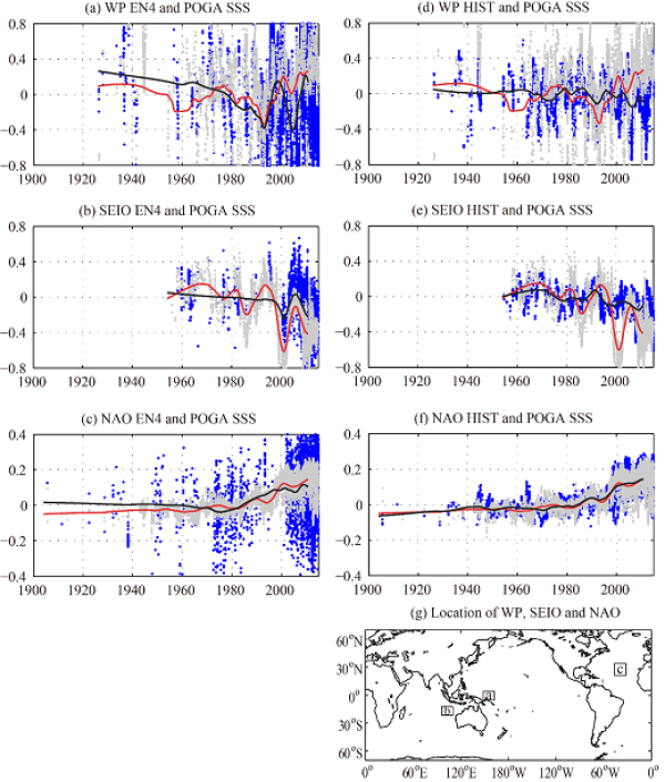 图2.热带西太平洋、东南印度洋及北大西洋海域POGA、HIST和EN4海表盐度异常变化时间序列。(a)热带西太平洋[150°E-160°E, 2°S-2°N],(b)东南印度洋[100°E-110°E, 20°S-15°S],(c)北大西洋[35°W-45°W, 25°N-35°N]。(a)-(c)为POGA(灰点,红线)与EN4(蓝点,黑线)结果;(d)-(f)为POGA(灰点,红线)与HIST(蓝点,黑线)结果;(g)方框为热带西太平洋,东南印度洋及北大西洋所在位置