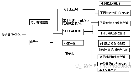 在建立化合物的HPLC方法时,可以首先根据化合物的分子量大小,极性大小及PKa,选择合适的分离模式,在适当的分离模式下去再去优化同类的色谱柱及流动相。化合物分子量<2000Da时,可根据图1来选择: