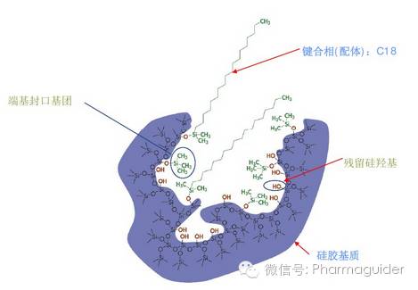 硅胶键合相填料中有部分未封端的残留硅羟基,如图封端可以减轻待测组分与硅胶表面残留的酸性硅羟基反应,改善保留和峰形,这对于碱性化合物尤其重要。