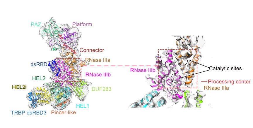 过去十年的时间里,王宏伟以及其他课题组都尝试运用单颗粒电镜的方法去解析人源核酸内切酶Dicer蛋白的三维结构。经过不断地摸索,研究组解决了蛋白质样本准备、冷冻样本制备、数据收集及处理等多方面的技术难题,最终采用从哺乳动物293F细胞系中共表达蛋白复合体,亲和层析分离纯化蛋白质,采用纯金或者镀金载网制备出了分布较为均一、优势取向相对较少的冷冻电镜样品,并获得获得了人源Dicer及其辅因子蛋白TRBP复合体的高分辨率三维结构(4.4 埃)(上图),首次解析了人源核酸内切酶Dicer蛋白的高分辨率整体结构,看到了核酸内切酶Dicer蛋白中各结构域的精确三维分布及结构域之间的空间关系。