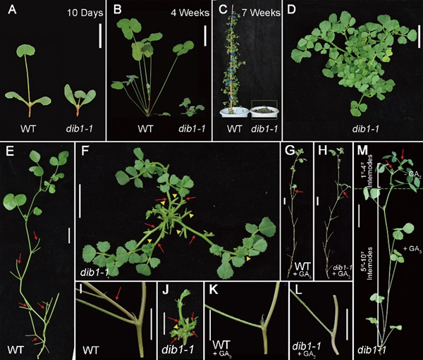 豆科植物蒺藜苜蓿具有二倍体、基因组较小、闭花自花授粉、遗传转化体系较为成熟等优点,因而是豆科的模式植物。中国科学院西双版纳热带植物园热带植物资源可持续利用重点实验室研究员陈江华团队从蒺藜苜蓿突变体库的资源中分离到矮化且分枝数量增多的突变株系dwarf and increased branching 1(dib1)。细胞学分析显示,茎节间细胞长度和细胞数目减少共同导致突变体矮化;统计学分析表明,dib1突变体的二级分枝数量显著多于野生型。研究人员通过基因组重测序与遗传连锁分析,克隆dib1基因。进化分析说明,该基因编码的蛋白dib1是豌豆中LE/PsGA3ox1的直系同源蛋白,暗示该基因可能参与GA的生物合成;进一步通过测定激素含量,证实dib1突变体中的活性GA显著下降。此外,在突变体中多个GA合成基因的表达量上调,并且通过对突变体施加GA,可同时恢复株高和叶腋发育上的缺陷。该研究揭示dib1通过影响蒺藜苜蓿体内活性GA的含量,从而调控其株高和分枝数量。相关研究成果以Dwarf and Increased Branching 1 controls plant height and axillary bud outgrowth in Medicago truncatula为题,发表在Journal of Experimental Botany上。版纳植物园博士研究生张晓嘉为论文第一作者,研究团队成员刘宇和陈江华为论文的通讯作者。研究工作得到国家自然科学基金-云南省联合基金、中科院战略性先导科技专项和中科院核心植物园等的资助。