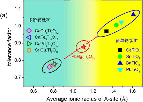 图1.简单钙钛矿和A位有序四阶钙钛矿(a)A位离子平均半径和容忍因子之间的对应关系;简单钙钛矿、A位有序普通四阶钙钛矿、PHTO四阶钙钛矿的配位结构