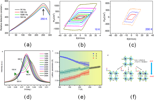图2.PHTO介电和铁电性能(a~c);特征衍射峰、衍射谱、晶格常数随温度的变化和TiO6八面体在结构相变前后变化的示意图(d~f)