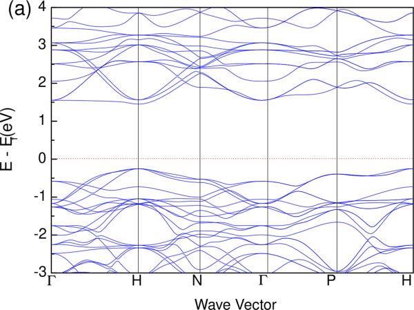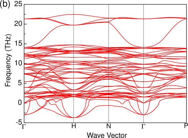 图3.第一性原理计算得到的PbHg3Ti4O12的(a)电子能带结构、(b)声子谱