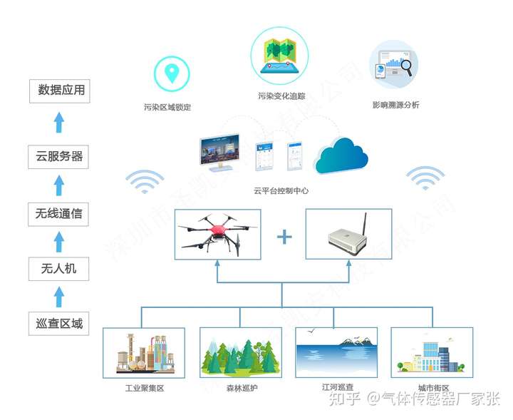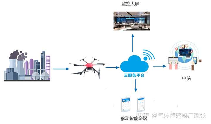 通过无人机搭载的智能气体传感器对大气污染因子进行数据采集,并对采集终端进行统一管理和监控,将采集到的大气环境数据通过无线接入方式存储到数据中心(云平台),通过在数据中心对采集的原始数据进行分析,产生分析结果数据,最终以服务的方式为演示终端软件、 移动端APP或者第三方气象、 环境应用提供数据支撑。