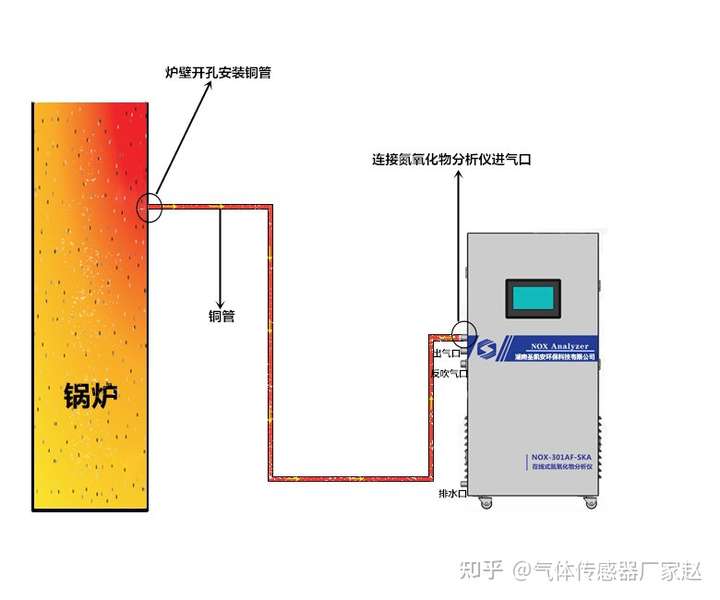 NOX浓度超标预警系统由采样系统、预处理系统、气体分析系统以及数据采集传输系统四部分组成。采样系统将采集的锅炉尾气进行初粉尘过滤后,送入预处理系统;预处理系统再对这些气体进行降温、除湿、二次过滤粉尘;气体分析系统对其进行进行各项烟气浓度检测分析,分析结果会在分析仪的显示屏上进行实时检测。同时,这些数据也会通过仪器内部的联网模块向外传输到PLC或者远程电脑、烟气浓度监测云平台等终端。