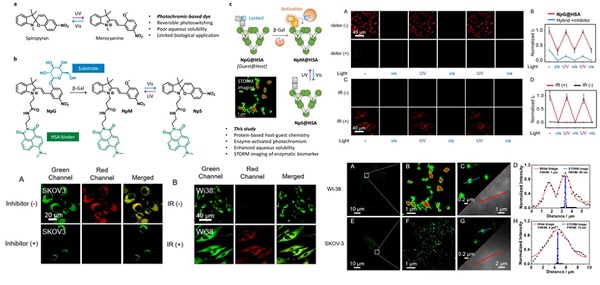研究人员基于前期开发的蛋白质杂交策略(Chemical Science, 2020, 11, 1107-1113),将酶切型光致变色糖基探针NpG与白蛋白HSA通过主-客体自组装的方式构建荧光复合探针NpG@HSA。β-Gal可将NpG@HSA的半乳糖基团裂解,释放荧光,从而实现对β-Gal的检测。借助NpG@HSA,研究团队实现对卵巢癌与正常细胞以及衰老细胞与正常细胞中β-Gal的活性的有效检测与区分,有望转化成β-Gal荧光检测试剂盒产品。得益于反应后产物NpM@HSA具备的优异光切换特性,利用STORM超高分辨成像技术,研究团队进一步实现不同生理病理情况下β-Gal的胞内精准定位,相比于宽场荧光显微镜图像,超高分辨图像具有更高的成像分辨率,达74 nm(图1)。NpG@HSA为胞内活性组分的超高分辨定位提供新的思路与化学工具(Journal of the American Chemical Society, 2020, DOI: 10.1021/jacs.0c05379)。