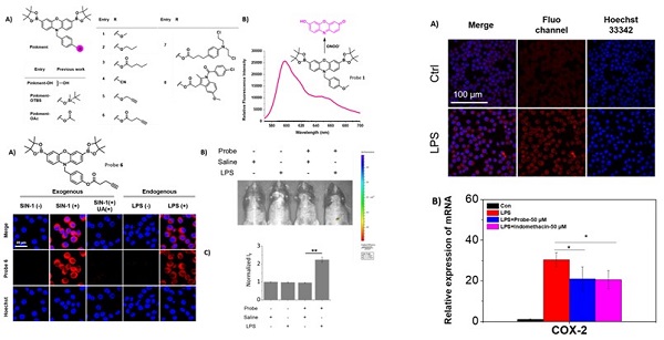研究人员基于Pinkment荧光团母核结构,设计合成6种荧光探针(Probe 1-6),均实现对胞内ONOO-的外源性、内源性的灵敏检测,其中,Probe 6可实现对小鼠急性炎症模型中ONOO?异常表达时的灵敏检测。研究团队基于此开发了针对ONOO-的荧光前药分子Probe 7与Probe 8。其中,基于Indomethacin的荧光前药分子Probe 8可实现对ONOO-的检测,且可根据ONOO-的异常表达实现药物释放,缓解炎症症状,实现诊疗一体化(图2)。未来,科研团队希望基于Pinkment的合成平台可用于其他双重生物活性分子检测、亚细胞器靶向与生物诊疗前药探针的开发研究中(Chemical Science, 2020, 11, 8567-8571)。