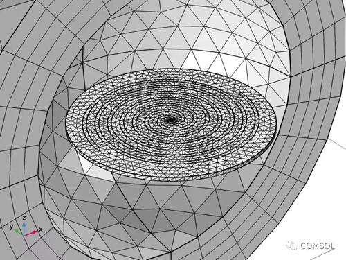 天线和基底被空气区域和完美匹配层(perfectly matched layer,简称PML)包围,PML 为上图灰色部分。右图的物理场控制的网格由软件默认生成。根据频域 研究步骤定义的最大频率,最大的网格尺寸被设为0.2 波长。网格还会通过一些材料属性进行自动缩放,比如介电基底内部的介电常数和磁导率。PML 层采用扫掠网格,沿着径向包含5个网格单元。